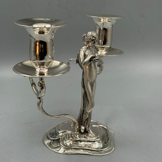 ART NOUVEAU 900 QARAT STERLING SILVER CANDELABRA – VINTAGE DECORATIVE TWO-LIGHT CANDLE HOLDER WITH LADY FIGURE