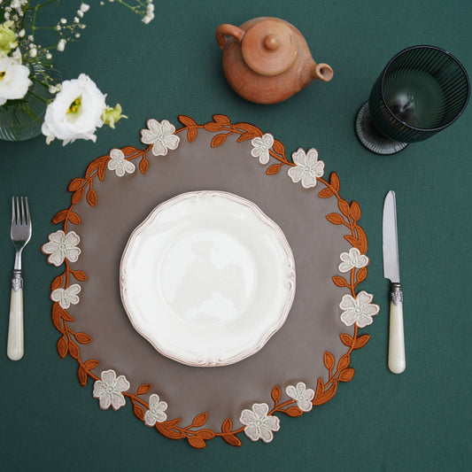 Elegant embroidered faux leather placemats – available in many designs and colors. Double-layered for extra durability and a premium look.