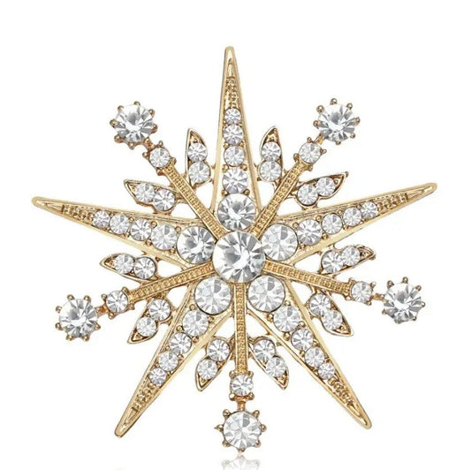 GOLDEN STARLIGHT RHINESTONE CRYSTAL STARBURST BROOCH